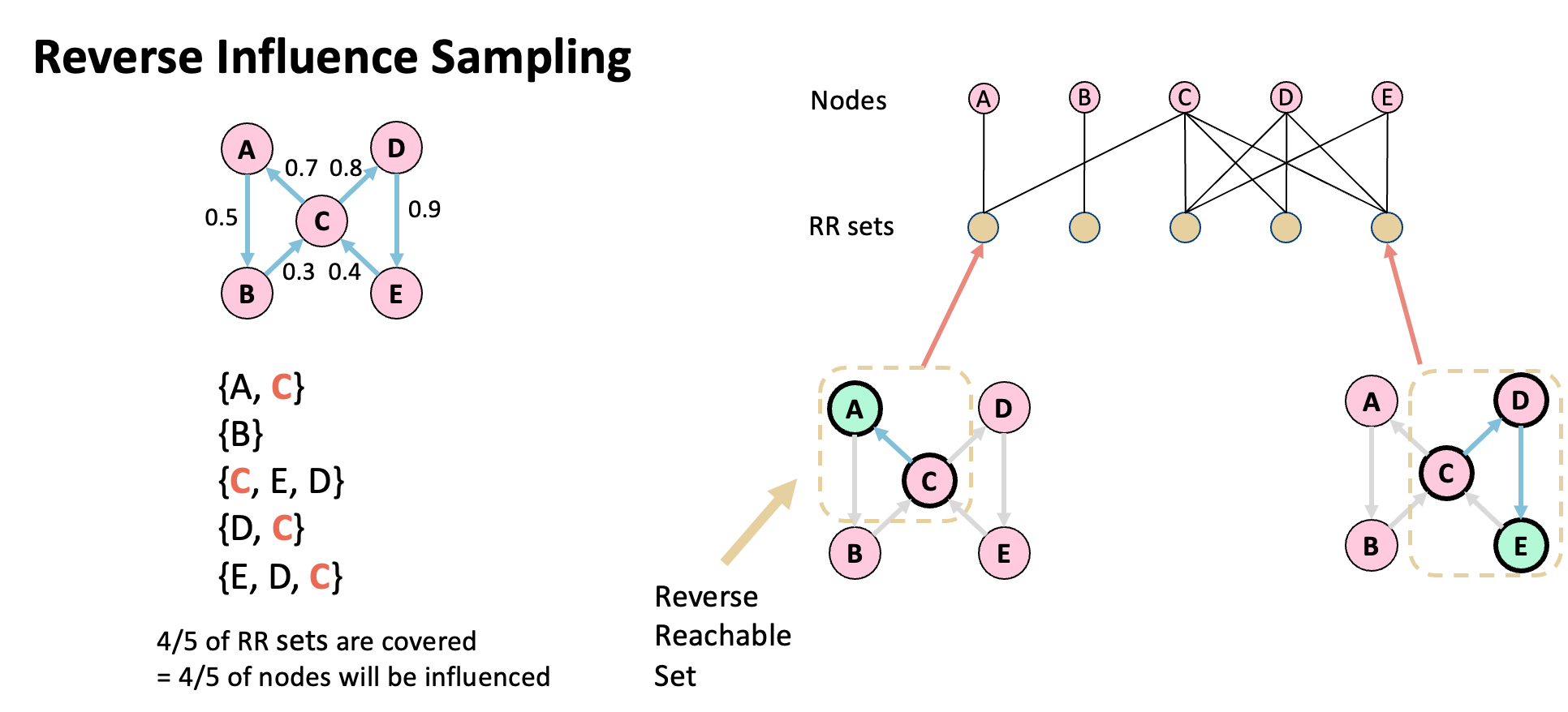 直觉上,如果一个种子节点影响力很高,那么它应该会经常出现在别的节点的RR-sets里,也就是说,它的coverage会很大。Borgs等人证明了这个coverage可以用来无偏地估计$S$的影响力。数学上来说,就是$\sigma(S)=n\cdot \mathbb{E}[ \frac{\Lambda_{\mathcal{R}}(S)}{ \mid \mathcal{R} \mid} ]$,这里的期望是作用在random RR-sets上,即根节点的随机性和传播过程的随机性。High-level地来讲,这个式子的意思就是假设有一堆random RR-sets,他们被$S$ cover的比例就可以(期望上)视作被$S$影响节点占总节点数的比例。 一个简单的示意图如下:
